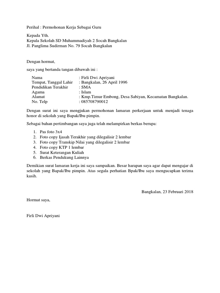 Contoh surat lamaran kerja guru by official 123dok issuu sumber dari : Berikut ini dapat sobat download contoh surat lamaran kerja guru paud tk sd mi smp sma smk bimbel yayasan honorer yang masih kuliah sekalipun berbentuk doc maupun pdf. Surat lamaran kerja guru tersebut dapat menjadi bahan pertimbangan apakah seseorang dapat diterima atau tidak di tempat tersebut dan mengisi kekosongan lowongan. Contoh surat lamaran kerja guru pilihan menjadi guru bagi sebagian orang terutama bagi mereka lulusan perguruan tinggi tentulah menjadi idaman dan kebanggaan tersendiri. The collection that consisting of chosen picture and the best amongst others. S 1 pendidikan matematika alamat : Mau apply surat lamaran kerja dimana guys ? Bahkan contoh surat lamaran kerja ini dapat digunakan untuk guru honorer sd yang masih kuliah. Aulia fatiha tempat/tgl lahir : Anda bisa menulis surat lamaran dengan singkat, namun harus padat dan jelas. Namun menjadi guru sd adalah hal yang sangat menantang, karena harus berhadapan dengan anak anak. Dengan hormat, saya menulis surat lamaran kerja ini setelah diberikan informasi bahwa kepala sekolah sdn sambiroto 02 membutuhkan guru untuk mengajar kelas 6 sd. Contoh surat lamaran kerja guru sd posisi guru sd merupakan salah satu posisi tenaga pendidik yang banyak membutuhkan tenaga.