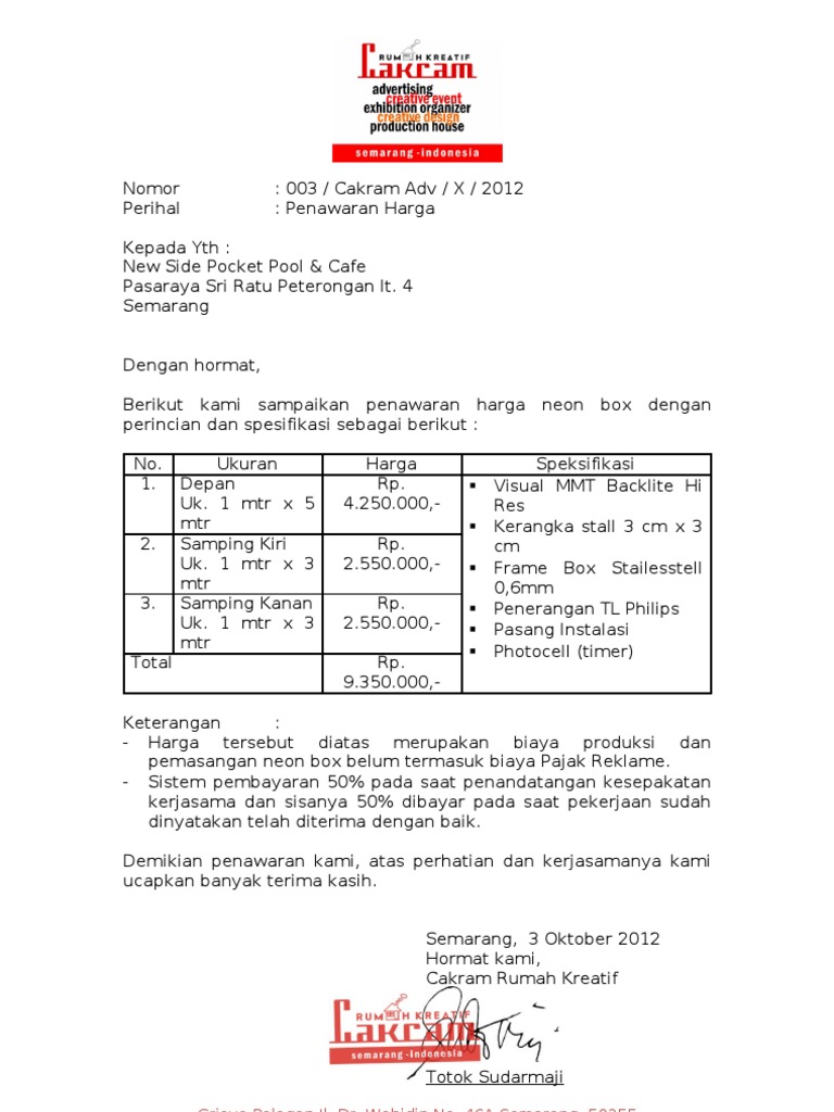 Kepada yth, pimpinan cv bukit wahid regency. Penawaran akan suatu barang, jasa bahkan kerjasama dengan pihak lain akan terasa lebih unggul dan baik apabila menggunakan surat penawaran. Dengan surat ini kami bermaksud untuk menawarkan jasa sewa alat berat untuk proyek yang se dikerjakan oleh pt. Peminat/pembeli bisa mengadakan survey ke lokasi yang sampai mekanisme proses akhir transaksi. Mulai dari contoh surat penawaran harga, contoh surat.